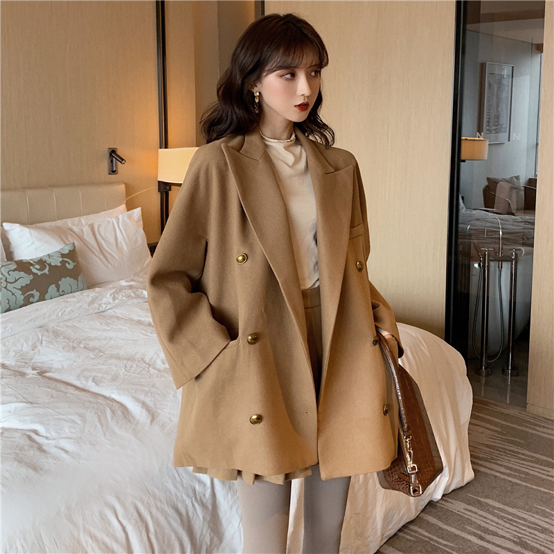 復古溫柔慵懶風隨意暖色系百搭寬松中長款毛呢外套女韓版呢子大衣