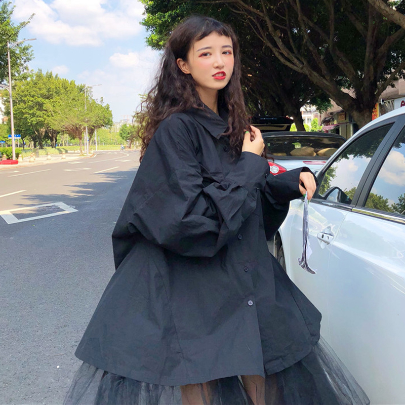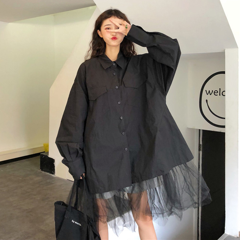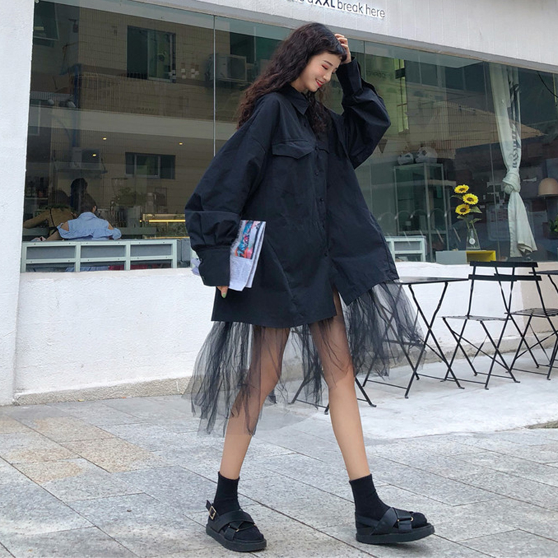 / 復古港味風上衣外套女秋冬裝2018新款中長款下擺網紗拼接長袖襯衫