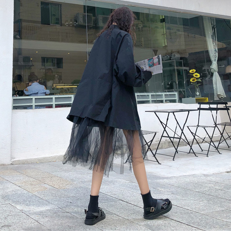 復古港味風上衣外套女秋冬裝2018新款中長款下擺網紗拼接長袖襯衫