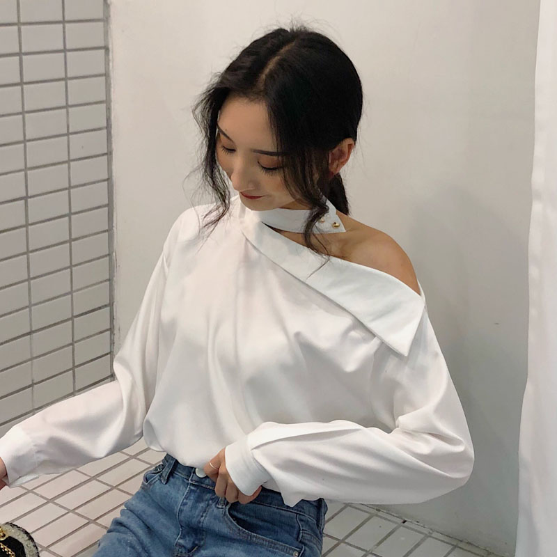 / 春裝新款女裝韓版復古掛脖斜肩長袖襯衫氣質寬松顯瘦露肩白襯衣女