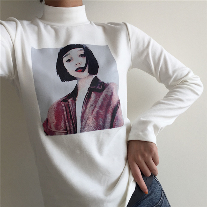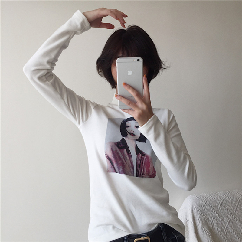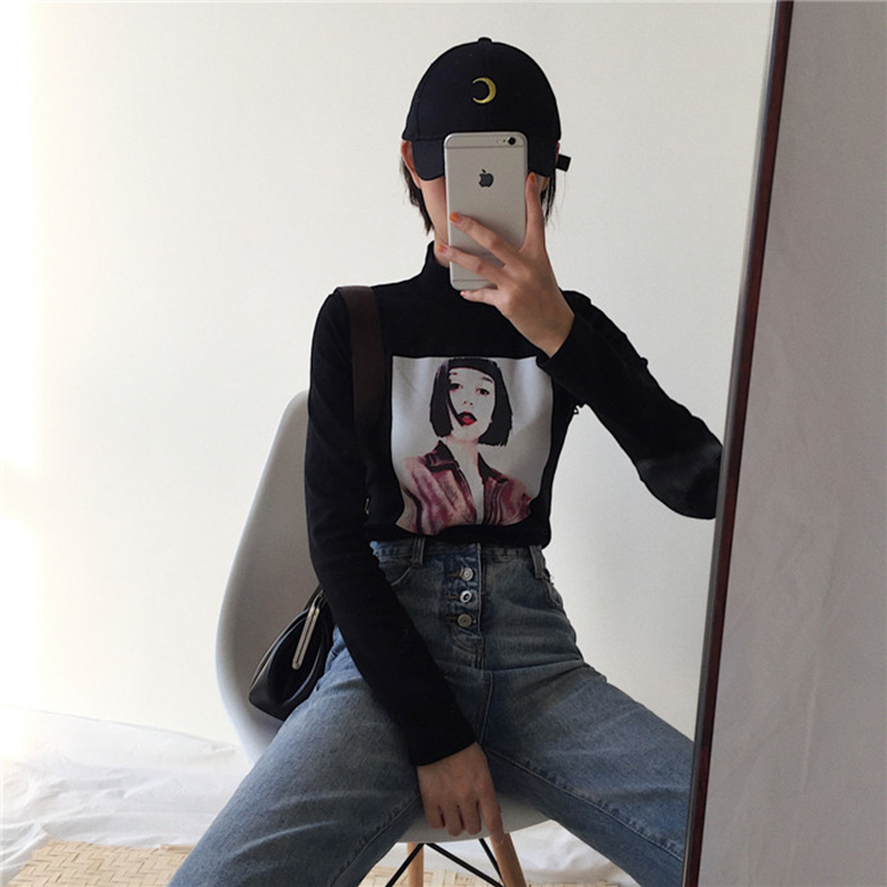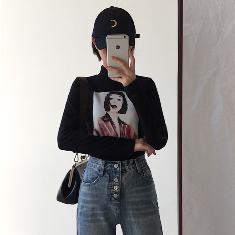 秋冬女裝2018新款港風修身小高領上衣復古頭像印花長袖T恤打底衫