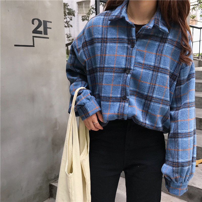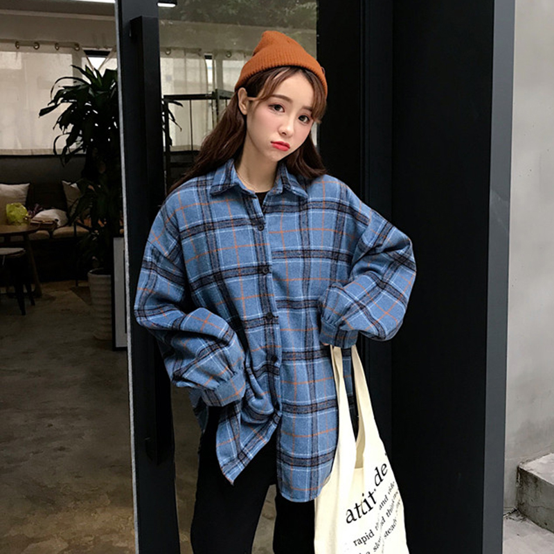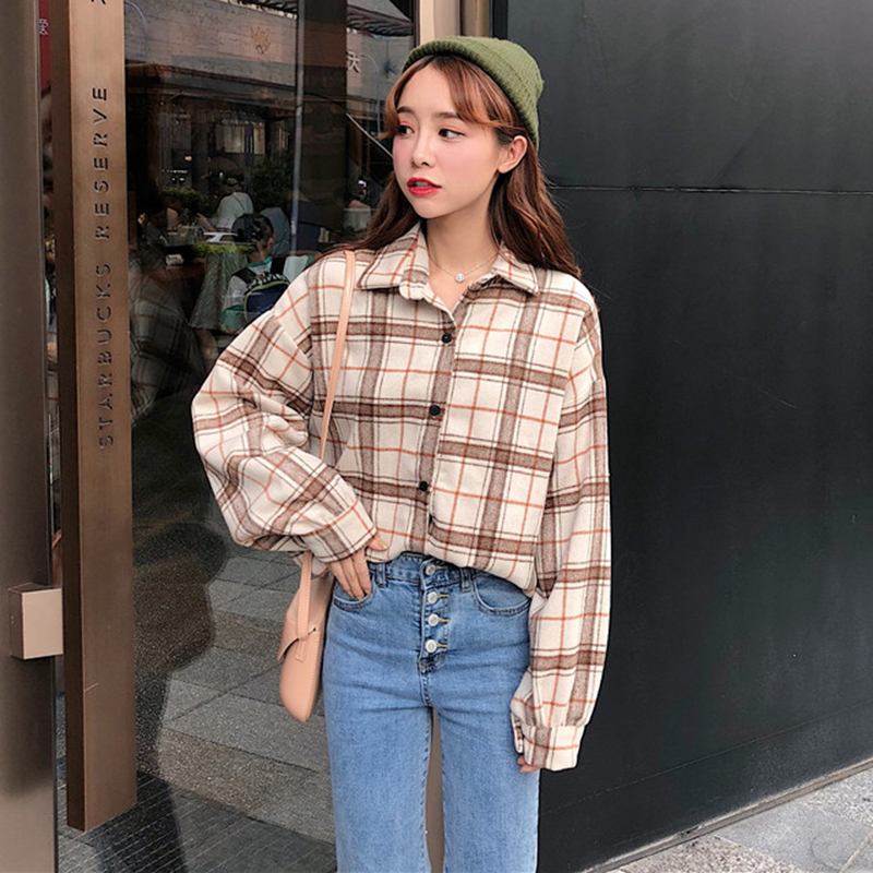港味復古格子長袖襯衫女秋冬裝2018新款學生韓版百搭寬松襯衣外套