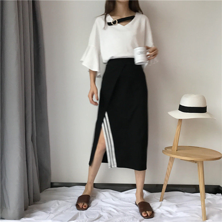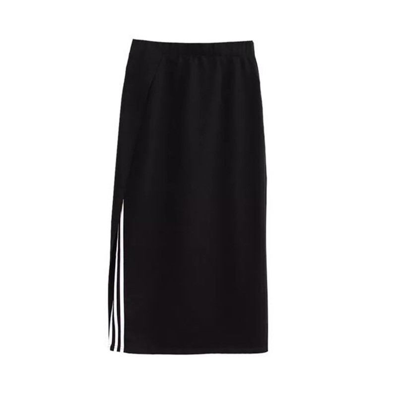 / 夏季女裝新款韓版顯瘦黑色高腰中長裙時尚條紋側開叉包臀半身裙潮