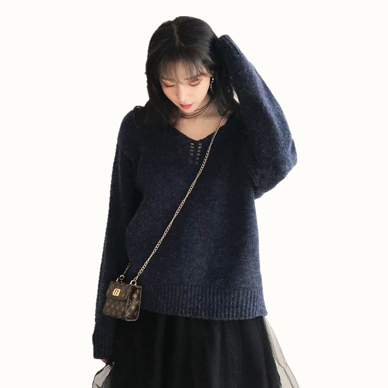 女裝2018秋裝新款復古寬松V領慵懶風毛衣學生長袖針織上衣打底衫