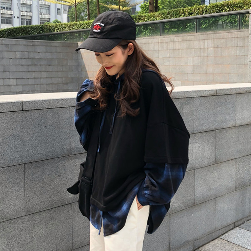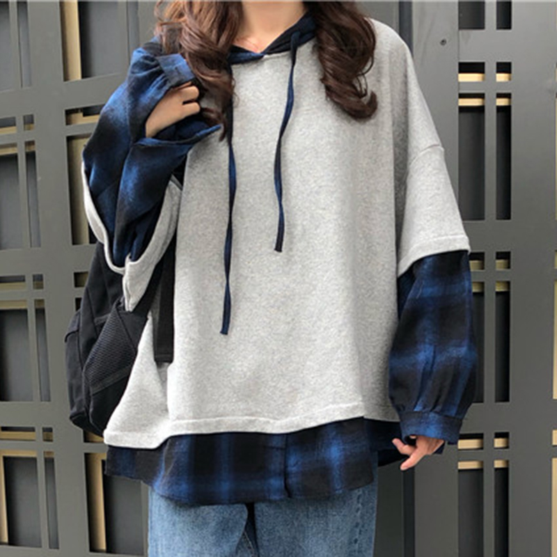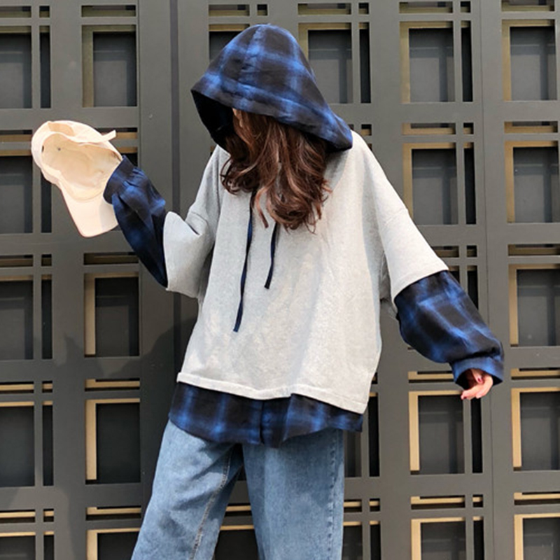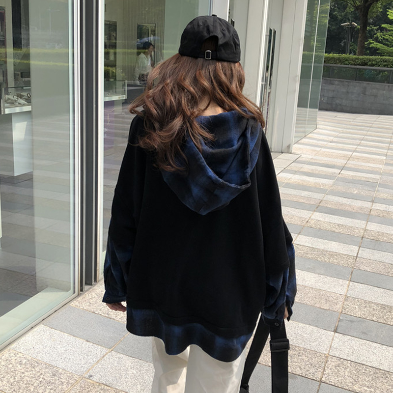 / 個性拼接格子假兩件連帽衛衣女秋裝新款寬松長袖上衣學生時尚外套