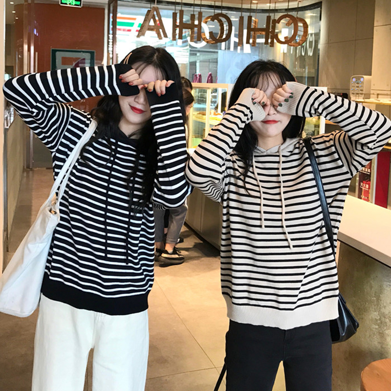 學生韓版連帽套頭針織衫女秋冬裝2018新款慵懶風撞色條紋毛衣外套