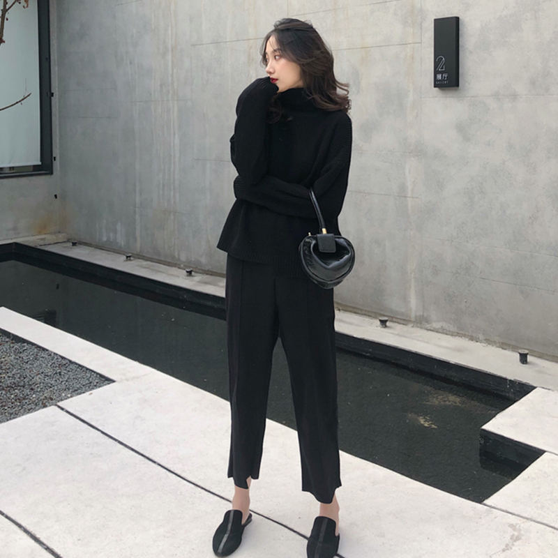 / 女神套裝秋冬新款高領針織毛衣毛呢休閑西裝九分褲高腰顯瘦半身裙