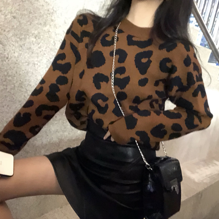 復古韓版新款女裝網紅同款超火豹紋針織衫女長袖秋裝寬松打底上衣