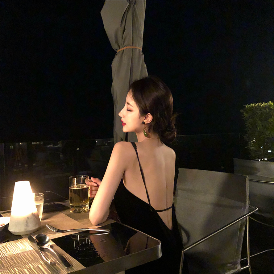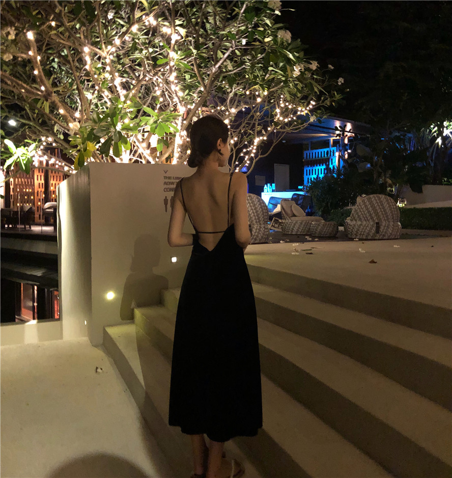 復古韓國chic風氣質黑色連衣裙女夏季度假長裙子露背小心機吊帶裙