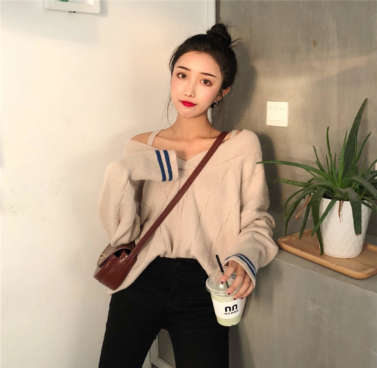 / 多穿法露肩V領套頭慵懶風毛衣女裝秋季新款時尚百搭韓版長袖上衣