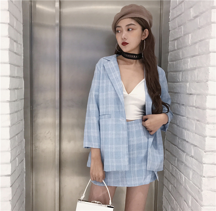 / 春季女裝新款韓國寬松顯瘦格子小西裝外套+格子短裙褲套裝分開拍