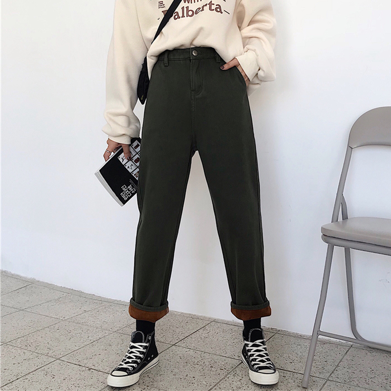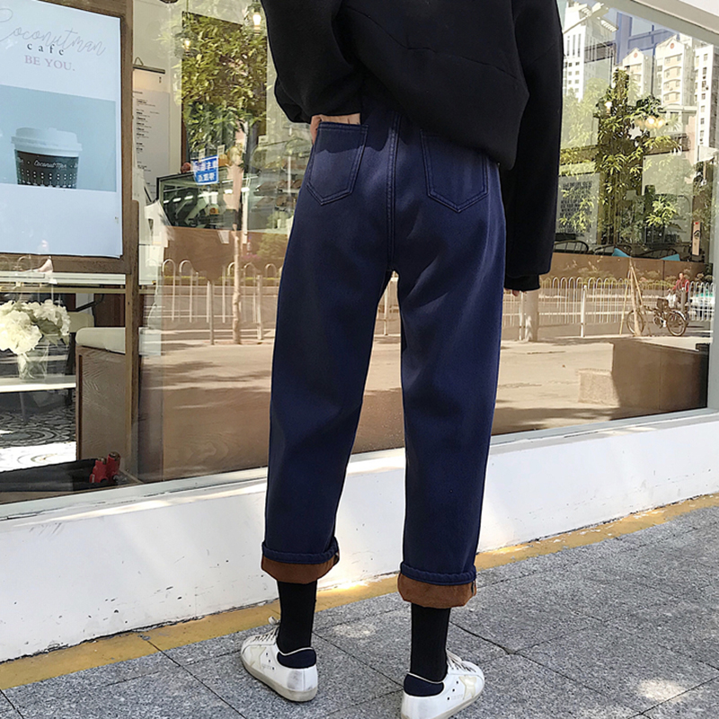 水洗加絨牛仔褲女冬裝2018新款韓版高腰顯瘦哈倫褲學生寬松九分褲