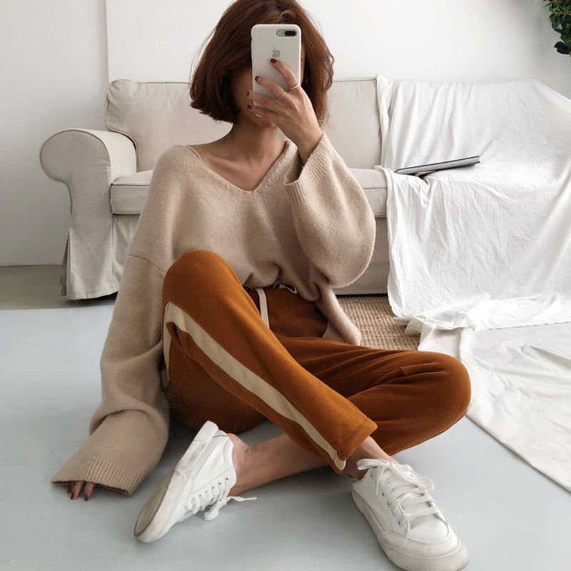 / 秋冬女裝2018新款韓版條紋拼色抽繩休閑褲高腰寬松顯瘦直筒長褲子