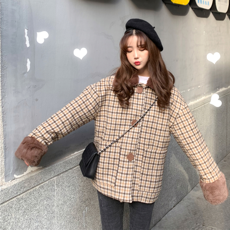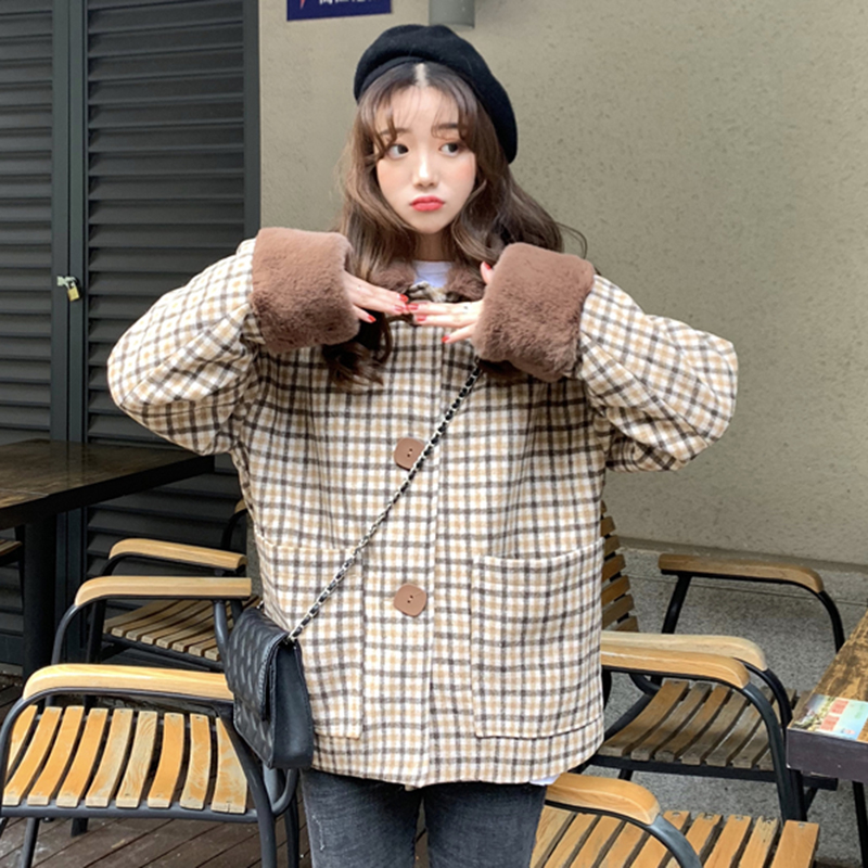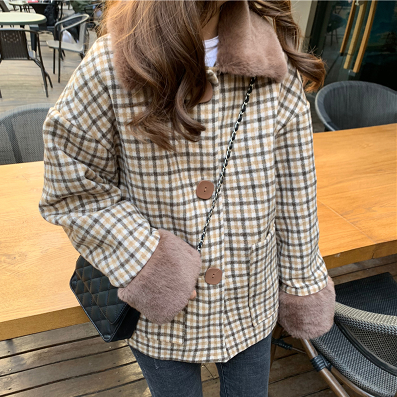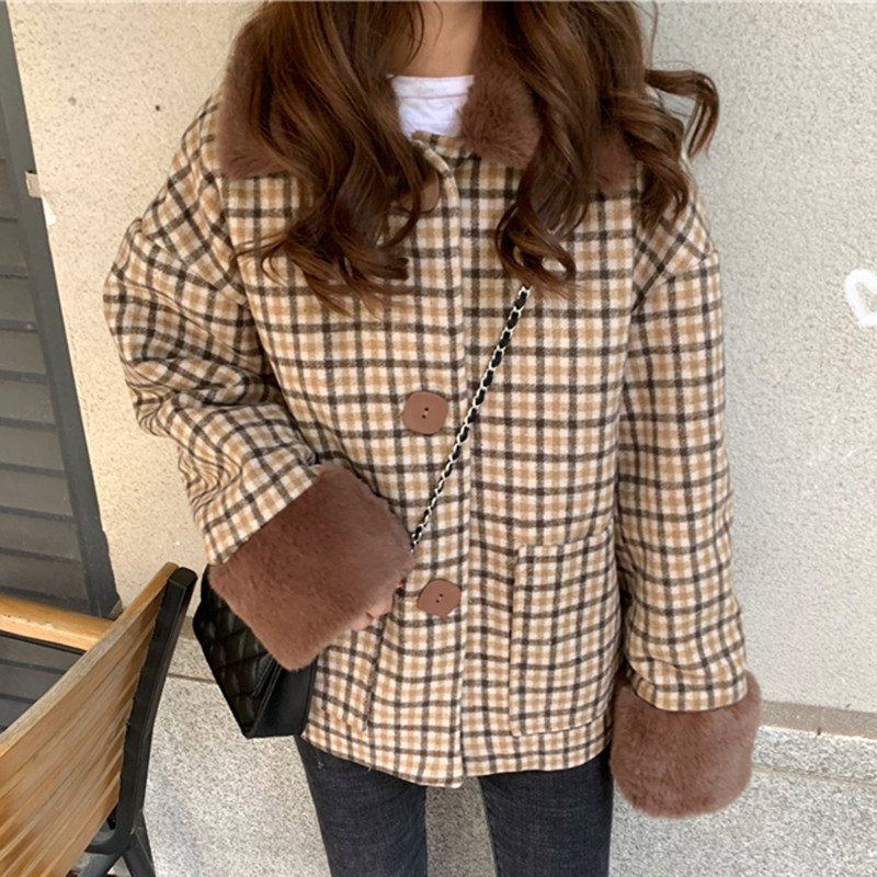 / 2018流行毛呢外套女秋冬裝新款拼接毛絨格子大衣休閑長袖開衫上衣