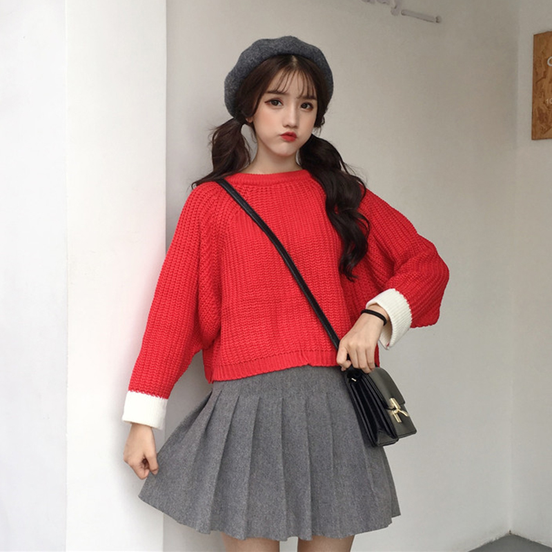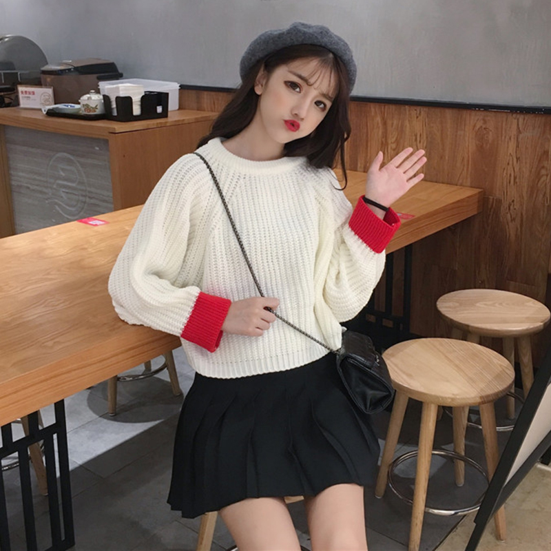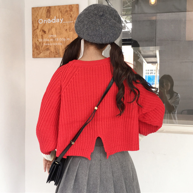 學生寬松短款后開叉針織衫女秋冬裝2018新款韓版百搭拼色長袖毛衣