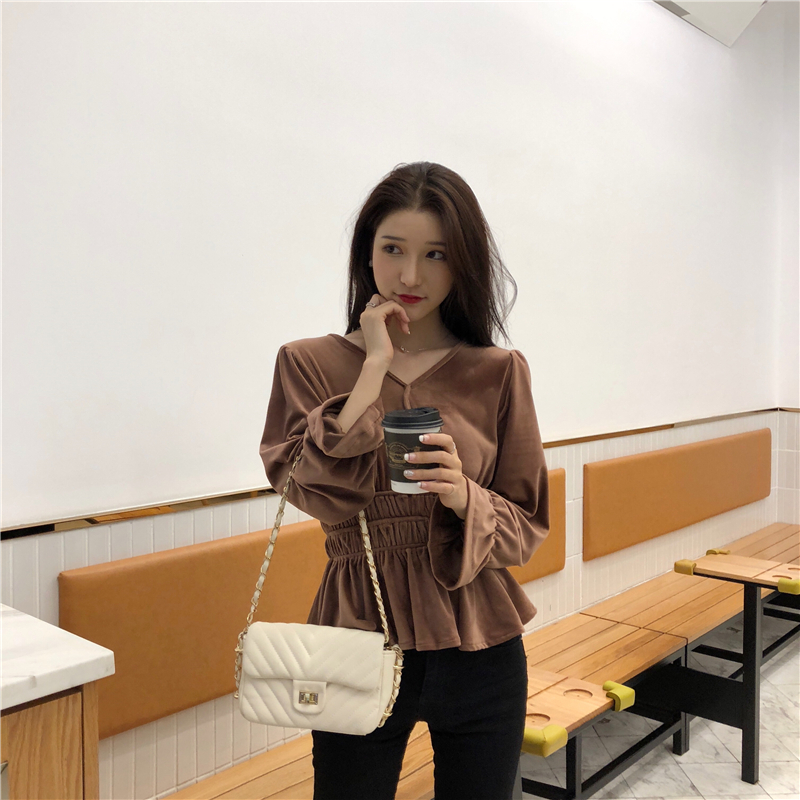 冬裝上衣女慵懶長袖t袖女韓版V領甜美金絲絨收腰百搭氣質打底衫女