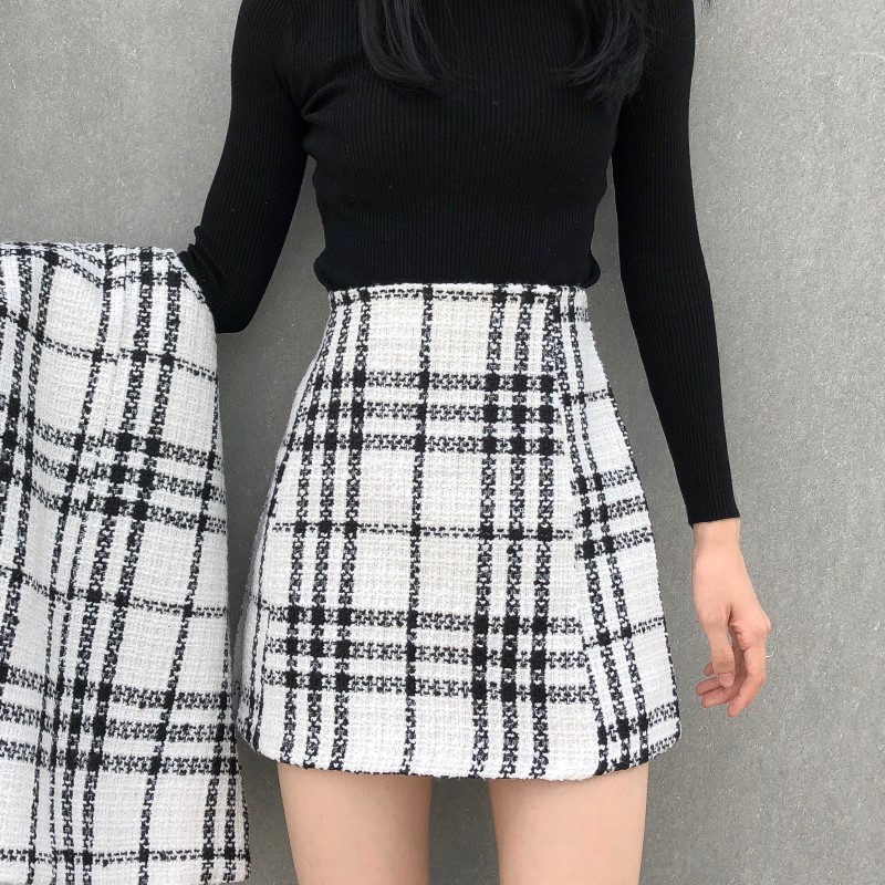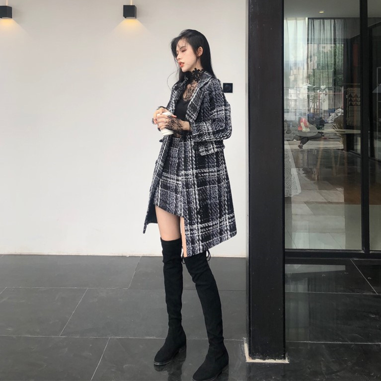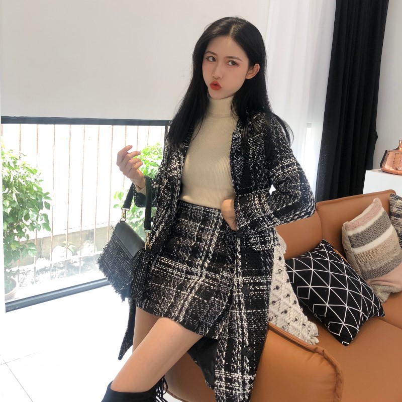 秋裝女2018新款格子西裝外套半身裙女+長袖針織衫+長袖網紗三件套