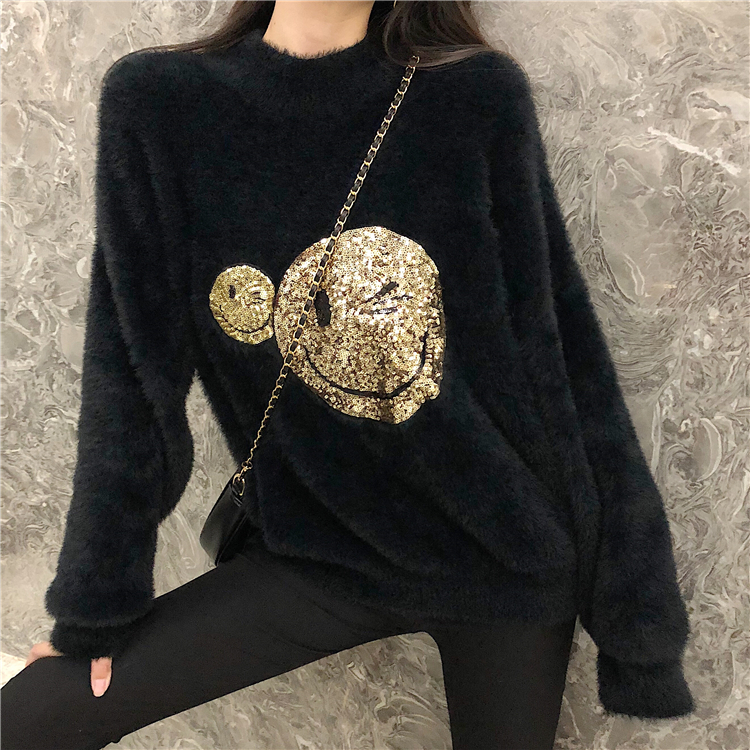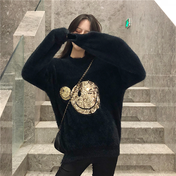 2018早秋針織衫女寬松慵懶黑色軟糯毛衣女毛絨絨圓領套頭笑臉上衣