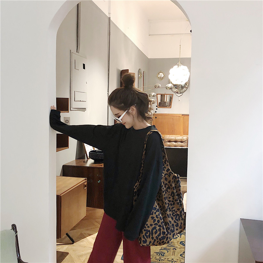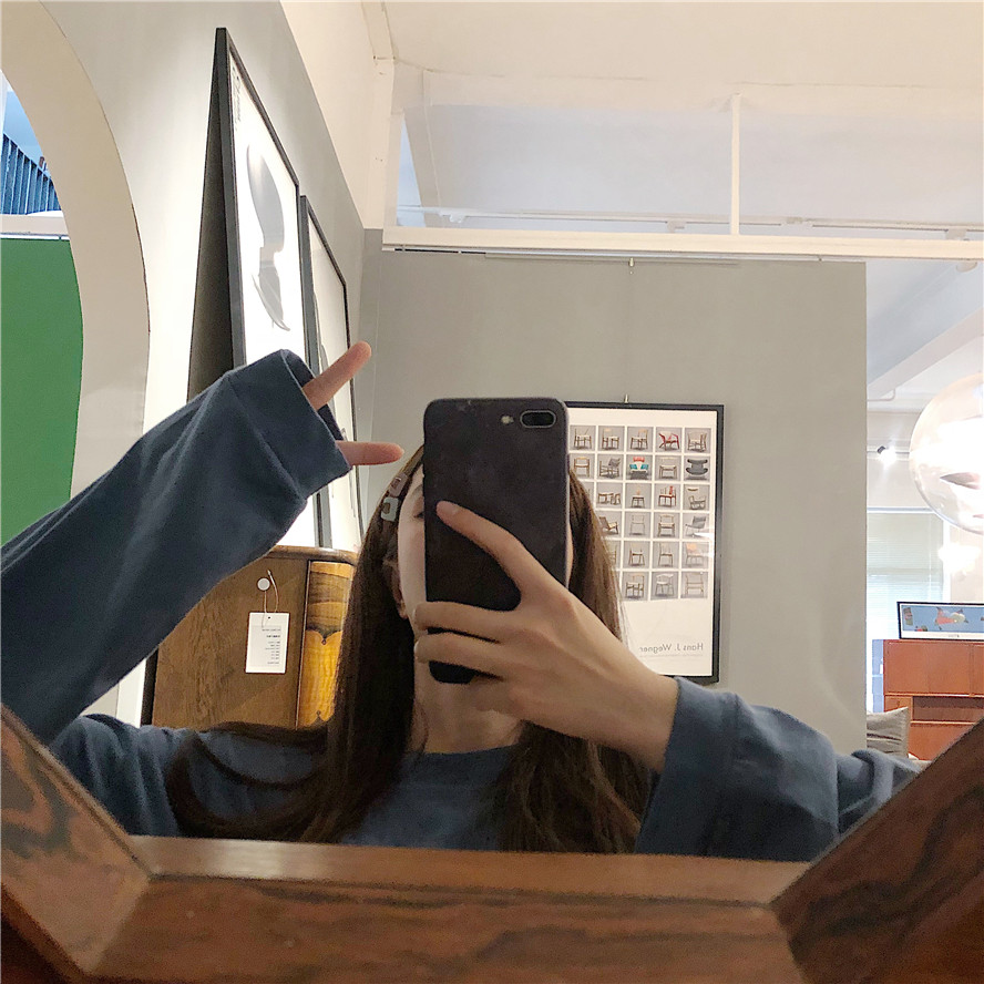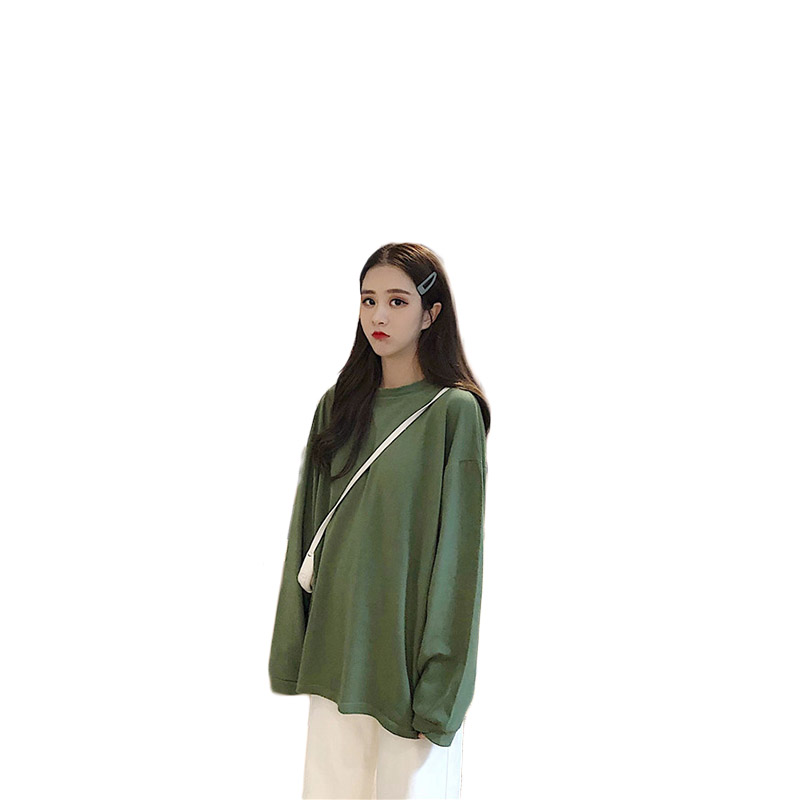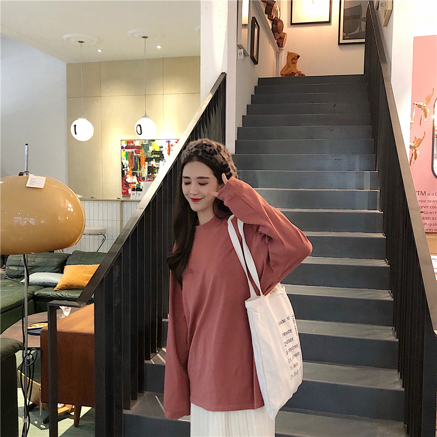 韓版時尚秋裝女2018新款寬松百搭慵懶純色長袖T恤中長款圓領上衣