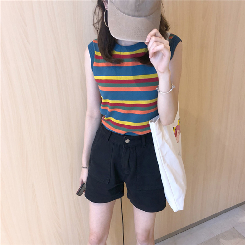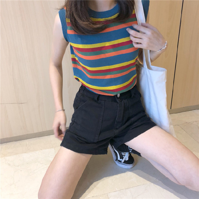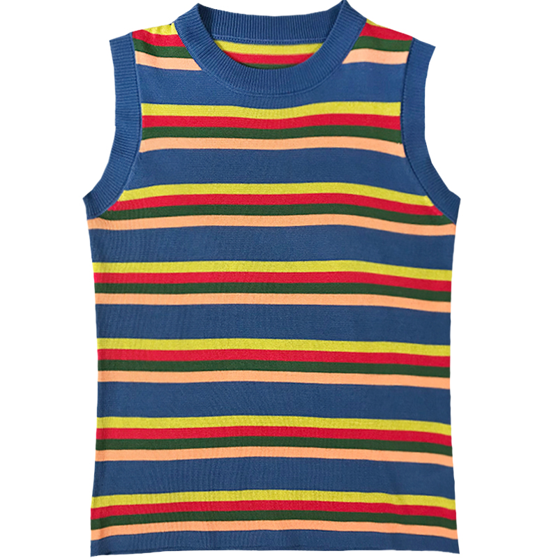 背心女夏季2018新款韓版彩虹條紋百搭無袖上衣圓領套頭寬松坎肩女