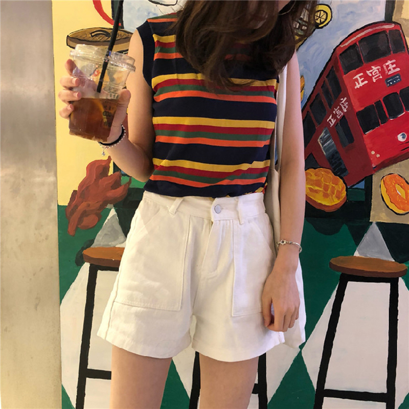 / 背心女夏季2018新款韓版彩虹條紋百搭無袖上衣圓領套頭寬松坎肩女