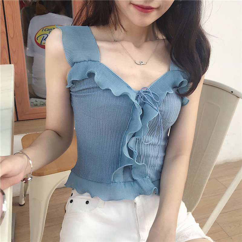 夏季新款女裝韓版短款木耳邊修身顯瘦針織吊帶復古百搭打底小背心