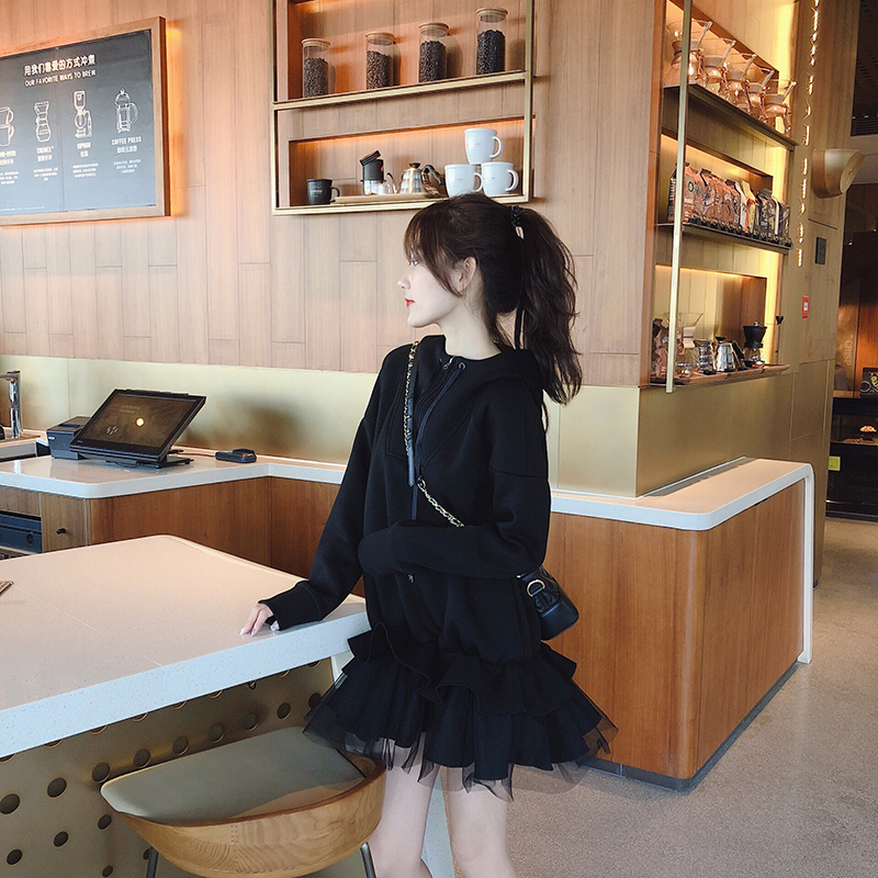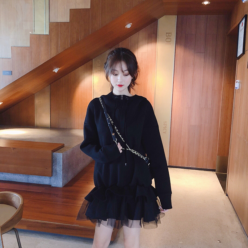 秋冬衛衣連衣裙女2018新款拼接假兩件紗裙少女裙長袖荷葉邊魚尾裙